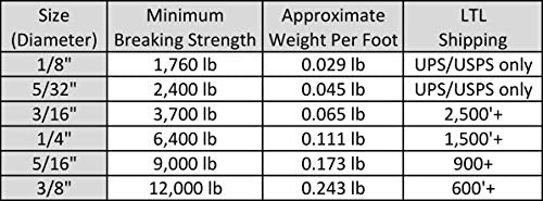 Details: Groove Industrial 1/4-inch Stainless Steel T304 Wire Rope products are manufactured to the highest standards to endure tough conditions. SPECIFICATIONS: 7x19 aircraft cable Breaking strength: 6,400 lb Weighs approximately 0.111 lb/per foot Grade 304 stainless steel for protection against rust and corrosion Other quantities and sizes available CHOOSING GRADE 304 vs GRADE 316 STAINLESS STEEL Both types of stainless steel are more corrosion resistant than galvanized steel. 304 is a good choice for exposure to many types of freshwater moisture (depending on the mineral content of the water), while 316 is the ideal choice for use in saltwater environments. 304 has a higher Minimum Breaking Strength than 316, but neither are as strong as galvanized. GROOVE INDUSTRIAL Backed by decades of experience, Groove Industrial provides top quality wire rope and rigging to customers across the USA and around the world. Our fully stocked warehouse in Nashville, TN, allows us to deliver orders quickly to most of the US. Not all of our inventory is listed online, so if you don't see what you're looking for, contact us. If we don't have it, we'll find it. We're happy to help you with anything related to our products and your project- please reach out us. We look forward to doing business with you!