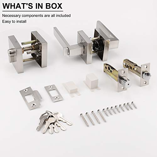Details: Entry Door Levers with Single/Double Cylinder Deadbolt Entry door lever with single/double cylinder deadbolt in satin nickel finish, the locks and deadbolts are keyed alike per 1/2/5/6/10 set in this listing. Designed to complement modern contemporary style interior and exterior doors for commercial and residential applications front entry door handleset lever and deadbolt set. Product information: ●Product Name: Door Handle Set with Single/Double Deadbolts ●Color&Finish: Brushed Nickel (Satin Nickel) ●Material: Solid Steel(Latch), Stainless Steel(Handle) ●Certification: ANSI Grade 3, Exceeds 200,000 cyles ●Package Include: Door lever, Latch, cylinder, mounting screws, strike plate and installation instruction ●Usage: Door handle with deadbolt for use on exterior doors where keyed entry and security is needed ●Warranty: 3 years color&finish warranty, replacement or refund for any Quality problem. ●Dimension: Adjustable Latch with backset: 60mm (2-3/8") or 70mm (2-3/4 ''); fit all doors 35 to 45 mm ( 1-3/8 '' to 1-3/4 '')thick Door Handle Set Features: ★Quality Guaranteed: Over 200.000 circles. Solid colum security bolt to provide anti-sawing protection. Solid stainless steel latch bolt available for high security. The structure is more reasonable and more durable. ★Easy Installation: Mounting screws included, installs with just a Phillips screwdriver ★Fast Delivery: Sent From USA, delivered in 3-5 workdays ★Brings Functionality to Your Home: While offering the trusted, enduring qualities , this collection features high style for the discriminating consumer These items are designed for US Market to ensure the highest quality for doors lockset and hardware.