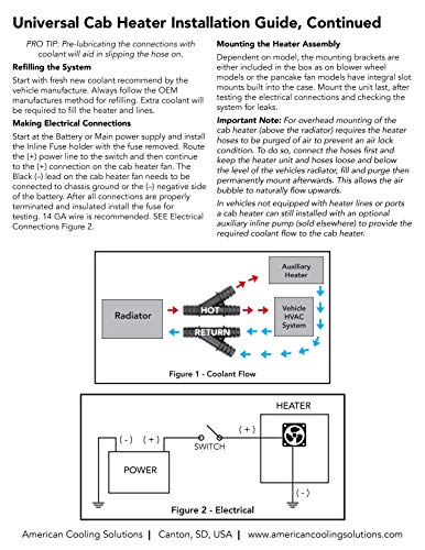 Details: 13,000 BTU Low Profile Universal Auxiliary Cab Heater – 12V Applications: Perfect for Tractors, Trucks, Buses, Vans, Cars, UTVs Our Part Number: 24751 Features: 12V Fan Motor, Adjustable Heat Outlet Ports, Compact Size, Installation Kit, Copper Tube Core Inlet / Outlet: 5/8” Hose Barb Overall Dimensions: 8-1/4” x 8” x 4-5/8” Included: -Heater Assembly -Mounting Brackets -“Y” Connectors for Coolant Lines -8 Hose Clamps -Fuse and Fuse Holder -Fan On/Off Switch Notes: Custom work may be required for installation 100% LEAK TESTED FROM THE FACTORY GUARANTEED FIT AND FUNCTION WARRANTY DETAILS: 12 MONTH WARRANTY AGAINST WORKMANSHIP DEFECTS WITH MONEY BACK OR REPLACEMENT GUARANTEE, BUT YOU WONT NEED IT!! SHIPPING DETAILS: WE DO NOT SHIP TO P.O. BOXES!! TYPICALLY SHIPS SAME DAY FROM OUR FACTORY NEAR SIOUX FALLS, SD