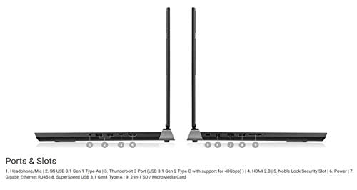 - 802.11 Wireless-AC; 1. Headphone/Mic | 2. SS USB 3.1 Gen 1 Type-As | 3. Thunderbolt 3 Port (USB 3.1 Gen 2 Type-C with support for 40Gbps) ) | 4. HDMI 2.0 | 5. Noble Lock Security Slot | 6. Power | 7. Gigabit Ethernet RJ45 | 8. SuperSpeed USB 3.1 Gen1 Type-A | 9. 2-in-1 SD / MicroMedia Card