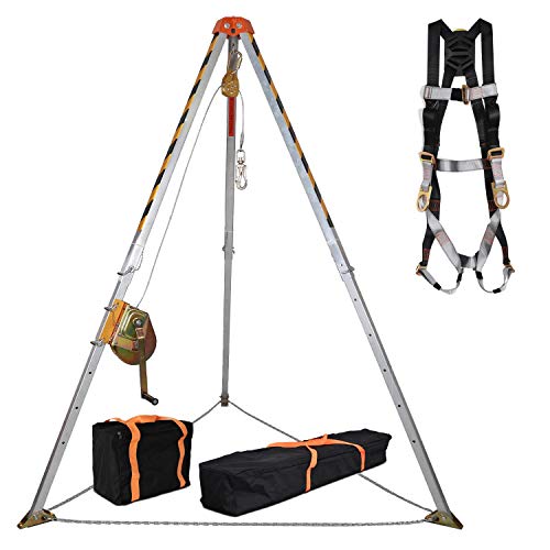KSEIBI 423990 Aluminum Confined Space Tripod Kit Manhole Entry and Rescue Equipment Set with 65' Winch, Pulley, Carabiner, Fall Protection Safety Harness and Carrying Storage Bag
