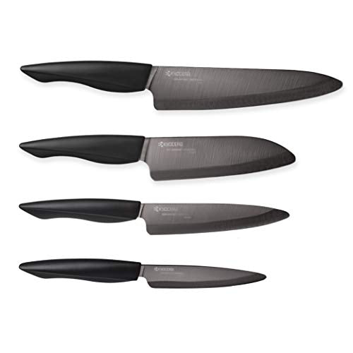 - Set includes (4) Kyocera Advanced Ceramic “Innovation Series” knives: 4.5-inch Utility, 5.0-inch Slicing, 5.5-inch Santoku, and 7-inch Chef's, Black Blades