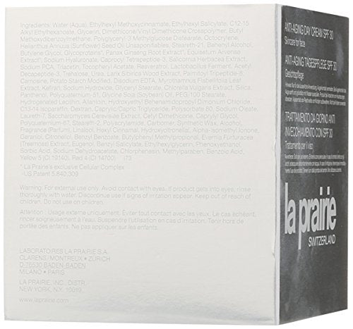 Details: La Prairie Anti Aging Day Cream SPF 30 A Cellular Protection Complex. It protects skin from UVA and UVB rays while fighting against other environmental stressors. Boosts collagen production to prevent lines and wrinkles by stimulating cell turnove