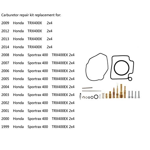 Details: Fitment Carburetor repair kit replacement for: 2009 Honda TRX400X 2x4 2012 Honda TRX400X 2x4 2013 Honda TRX400X 2x4 2014 Honda TRX400X 2x4 2008 Honda Sportrax 400 TRX400EX 2x4 2007 Honda Sportrax 400 TRX400EX 2x4 2006 Honda Sportrax 400 TRX400EX 2x4 2005 Honda Sportrax 400 TRX400EX 2x4 2004 Honda Sportrax 400 TRX400EX 2x4 2003 Honda Sportrax 400 TRX400EX 2x4 2002 Honda Sportrax 400 TRX400EX 2x4 2001 Honda Sportrax 400 TRX400EX 2x4 2000 Honda Sportrax 400 TRX400EX 2x4 1999 Honda Sportrax 400 TRX400EX 2x4 Note: This picture is of the actual kit you will get Please compare it to what you need to make sure it is the correct kit for you