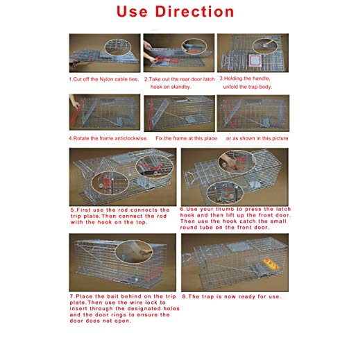 Details: Specifications:Dimensions: 24" x 8" x 7" / 32" x 13" x 11" OptionalMaterial: High quality galvanized wireFeatures:Solid ConstructionSafe&HumaneSensitive Capture&Safe ReleaseMulti-purposeEasy to Use Tips:1. You can wrap the cage in cartons or clothes, which will be more effective.2. Remember to put the cage in the place where the animals to be caught often haunt. It is generally recommended to put the cage at the root of the wall.3. Put some baits at the entrance around the cage.