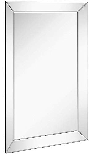 Details: One of our absolute favorites this elegant mirror framed mirror is a show piece for any room whether you are looking for a bathroom or powder room mirror or something in your dining, living room, waiting room or office. A substantial three inch angled mirror sides slope down to the large beveled rectangle wall mirror in the center. Our mirror comes secured to a solid wood backing to add stability and prevent distortion or warping. The wood backing includes our pre-installed slimline 1/4 inch hanging hardware hooks for hanging your mirror in both a horizontal or vertical fashion. The large central part is surrounded by a 3 inch mirror frame. We stand by our products and your happiness with a 100% money back guarantee. USA Company with 3 Generations of Family Values.