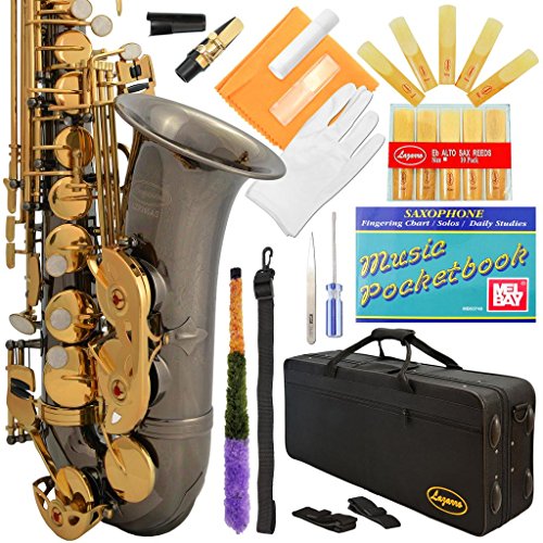 Lazarro 360-BN E-Flat Eb Alto Saxophone Black Nickel-Gold Keys with Case, 11 Reeds, Care Kit and Many Extras
