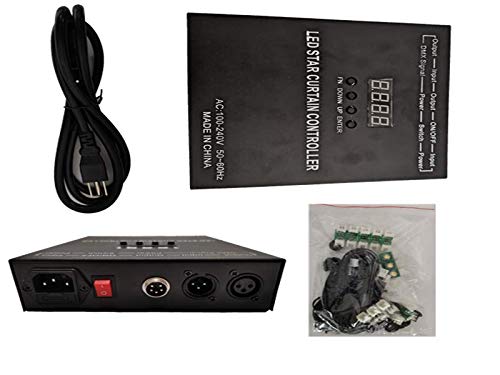 Details: LED Star Cloth is is the Perfect ultimate solution in backdrops for DJ's, touring, installation, events, displays, bands, clubs, presentations etc. 3 X 4 meter(9.84ft x 13.12ft) with 192 pcs RGBW LEDs( single Beads leds),The leds with high Brightness,long lifespan and color Pure Made from a certified flame retardant fabric(double layer fabric) . With Pre set programs,all color on ,auto run,sound active,strobe,dimmer,color change,DMX512 ect., Functions ,to meet your different requirements for your show. It's easy to stitch multiple star cloths into one big size and play sync LED star Cloth is fold-able,convenient installation and disassembly ,convenient to carry. 8 DMX channels to Meet your show requirements. reusable cable ties included. Custom function:can set min brightness(0-100) and max brightness (100-255) value by controller menu,Such as,set min brightness value at 10,and max brightness value at 200,the brightness change will start from value 10 to 200. Specifications LED Quantity:192 RGBW leds(one led with one single color only) DMX channels:8CH DMX connection:3P XLR Connector:5P XLR (LED Curtain) Power supply:AC 90V~240V, 50Hz-60Hz Dimensions of LED curtain: 3mx 4m (HxW) Weight LED curtain:5.5kg Weight of Controller:1KG 8 Channels CH1 000-255 Total Dimmer CH2 Strobe 000-000 No Function 001-009 Close Light 010-255 Strobe from Slow to fast CH3 Maros 000-050 No function 051-100 Jump change 101-150 Gradually change 151-200 Pulse change 200-255 Sound active CH4 000-255 Marcos speed CH5 000-255 Color 1 CH6 000-255 Color 2 CH7 000-255 Color 3 CH8 000-255 Color 4 Package included 1 LED star Cloth:1pcs 2/Controller:1pcs 3/Power Cable(us plug):1pcs 4/reusable cable ties 5/Spare parts:Included LED boards,cables,fastening pieces 6/User Manual:1pcs