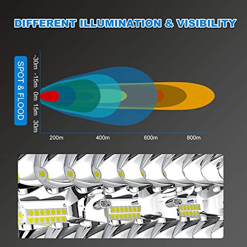 - 【COMBO BEAM DESIGN】New designed scientific light distribution structure, centered 170° flood LEDs surrounded by dual row 30° spot diodes, offering a perfect focused light with large-angle flood beam around to acheive both longer range and wider vision.It also provides better vertical distribution of light, greater light utilization, and reduced scatter, making it an ideal off-road light or driving light.
