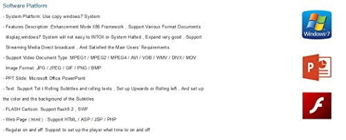 Details: Software Platform - System Platform: Use copy windows7 System - Features Description: Enhancement Mode X86 Framework,Support Various Format Documents display,windows7 System will not easy to INTOX or System Halted,Expand very good,Support Streaming Media Direct broadcast,And Satisfied the Main Users’ Requirements. - Support Video Document Type: MPEG1 / MPEG2 / MPEG4 / AVI / VOB / WMV / DIVX / MOV Image Format: JPG / JPEG / GIF / PNG / BMP - PPT Slide: Microsoft Office PowerPoint - Text: Support Txt t Rolling Subtitles and rolling texts,Set up Upwards or Rolling left,And set up the color and the background of the Subtitles - FLASH Cartoon: Support flash9.2,SWF - Web Page(html): Support HTML / ASP / JSP / PHP - Regular on and off: Support to set up the player what time to on and off